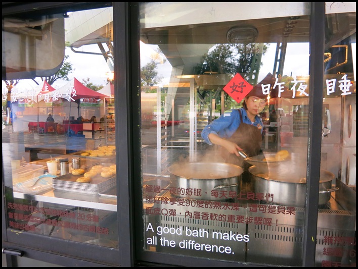 玻璃窗內的工作人員正在製作貝果,原來貝果是先用熱水燙過才進烤箱的啊