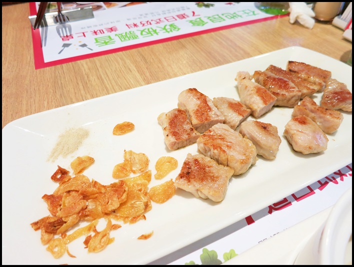 主菜我點了網路上許多人推薦的嫩煎豚五花,蒜片跟胡椒鹽會附在旁邊,