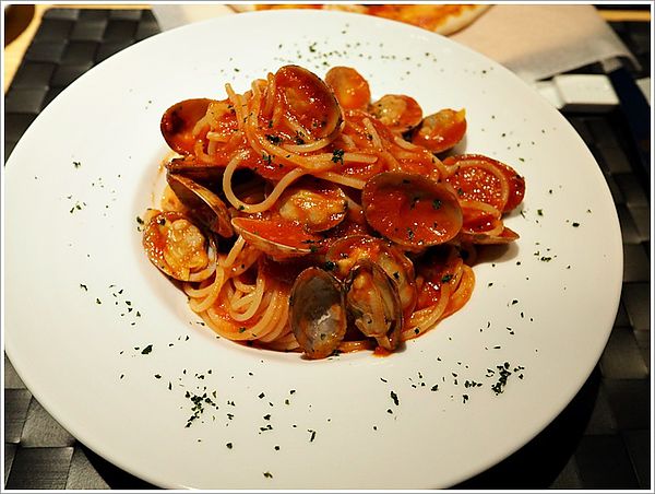 再來是波妞媽期待的義大利麵上桌了(蕃茄紅蛤義大利麵$240)~果然是從日本來的,麵的彈牙度跟醬汁的口味,真的跟在日本吃的一模一樣,吃了真的以為自己在日本~這個紅醬是用新鮮的蕃茄去熬製的,所以會比台灣吃的紅醬略酸一些;海鮮也不是用台灣常用的蛤蜊而是用海瓜子,盤子幾乎一半以上都被海瓜子佔據了!波妞爸數了一下,大概給了14顆,用料非常的實在~