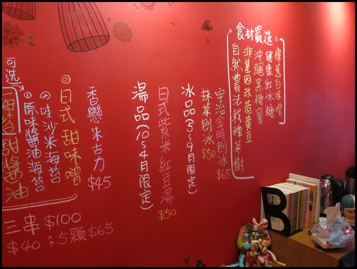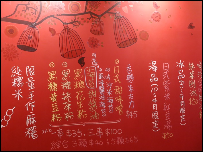 菜單就在牆上,純糯米限量手作麻糬有黑糖口味三種、鹹口味三種,