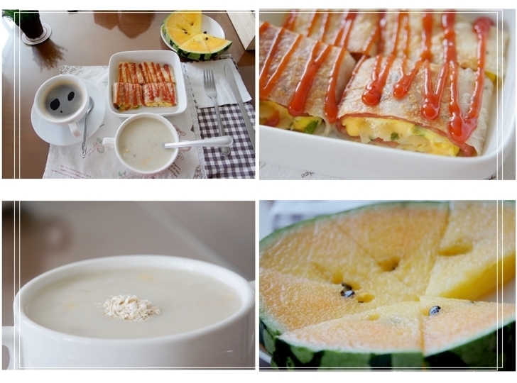 民以食為天,這裡的早餐也是老闆自己研發的,她告訴我是蛋餅時,我還真不相信,這蛋餅皮是脆的,裡面包著火腿、蔥蛋和起司,淋上蕃茄醬,口感很特殊,滿好吃的;一碗鹹粥;一杯咖啡或果汁;一份水果,好豐盛的早餐。