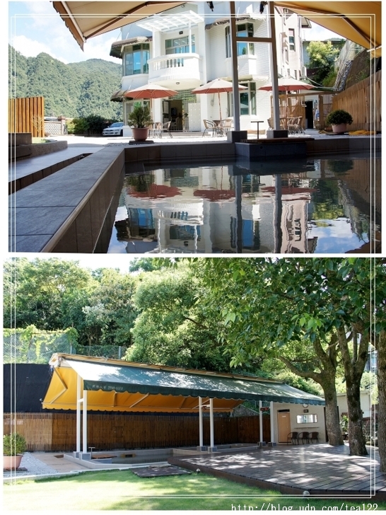 別以為這就是沐嵐小鎮,走出後門,哇!這才是精典,空地上三張咖啡桌,那大樹蔭下,是有遮陽的露天溫泉池,烏來溫泉屬弱鹼性碳酸泉,水質清澈明並且可以飲用,這裡的大眾湯擁有冷、溫、熱三種溫度,誰說夏天沒人泡溫泉,在這環山圍繞,清風徐徐地山野裡,這簡直是豪門大戶的私家游泳池,我當下就恨不得縱身跳下池。