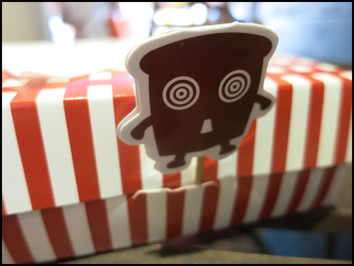 牙籤上頭套了這個卡通土司,是烤焦了的表情嗎?^^