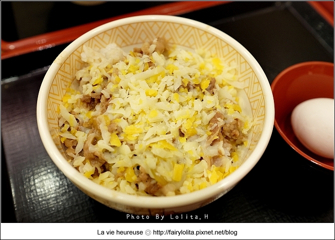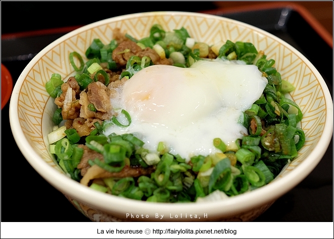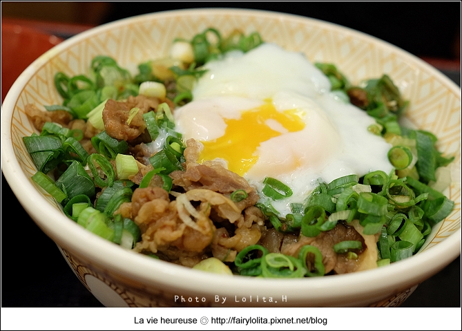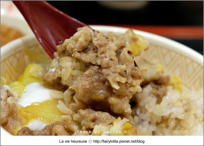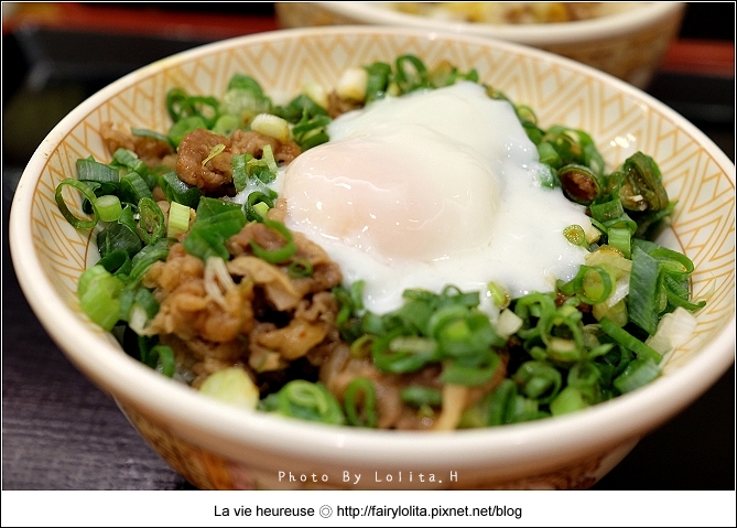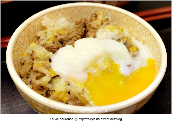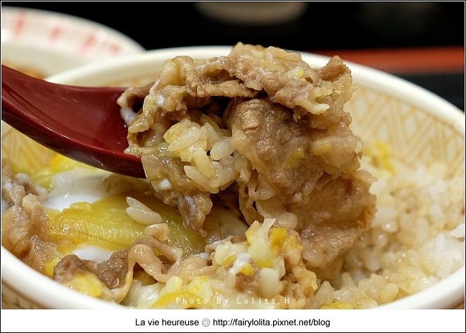 牛丼沾著蛋液一塊吃,完全就是美味,不過它的蔥反倒沒那麼讓人滿意,吃來嗆味重,香度卻不高,不過價格便宜也沒什麼好挑剔的啦!