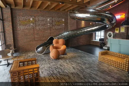 大廳這座溜滑梯就是他和公共藝術家張金峰聯手打造的