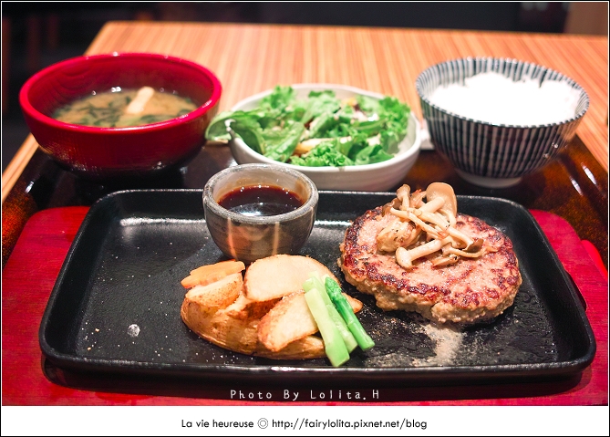 在到やよい軒之前我就已經做好功課了,這道漢堡排聽說是店家的招牌兼人氣,所以在點餐時我也沒什麼考慮,直接點了這份定食,然後按確定,除了主餐漢堡排,一旁還有米飯、沙拉及味噌湯,份量我想是比較適合女孩兒食用,如果不續白飯,大胃王根本只是塞牙縫來著XD