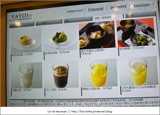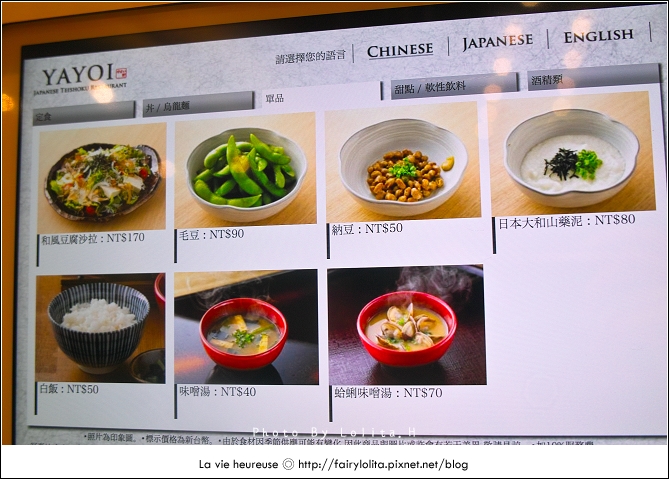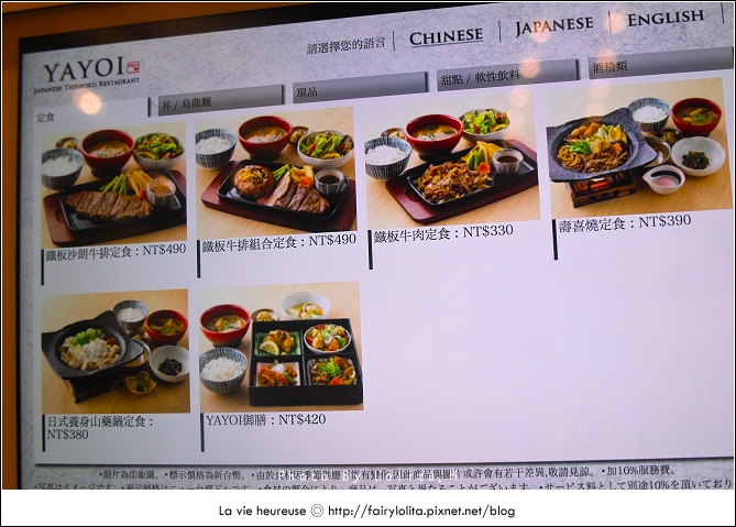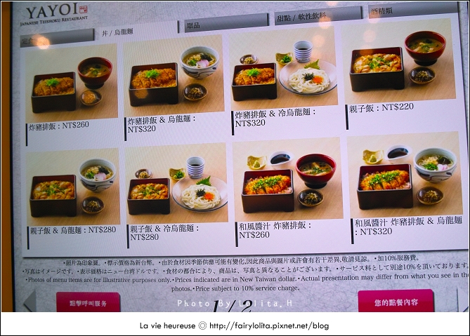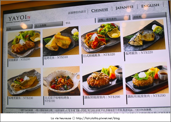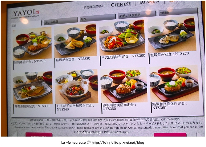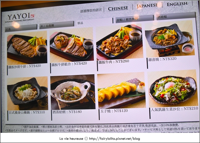 花了一點時間把所有菜色拍上來給大家參考,最便宜的價格是定食類的260大洋,高則到近500元都有,再加上服務費,老實說其實並不算便宜,不過它的餐點有好幾樣都有吸引到我,難不成是圖片拍得太誘人嗎?!>///< 而且選擇也很多呢!