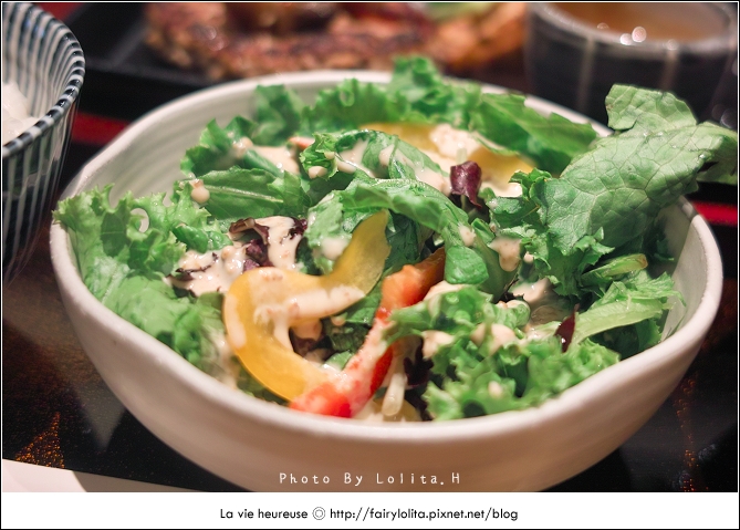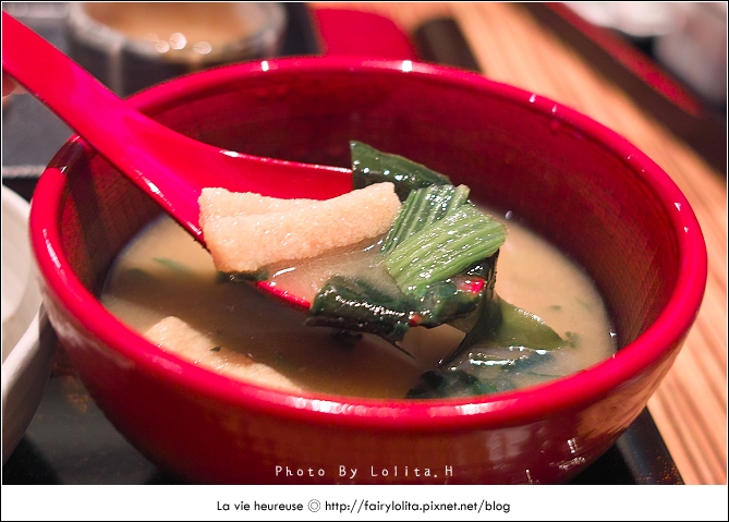 味噌湯中添加了豆皮條、菠菜及海帶芽,滋味偏鹹,不過味噌香還挺重的。