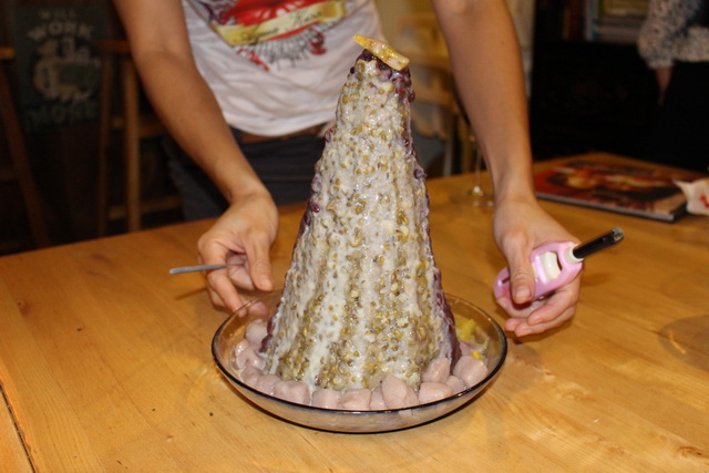 當然,來「水吻2」一定要吃冰啊!冰品乃是老闆的看家本領。夏天的芒果冰是主力,冬天就來個火山冰吧!這一座高聳的火山冰,大改有30公分高吧?好壯觀喔!