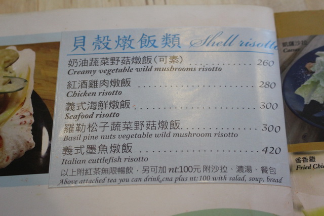 主廚虎爺曾經任職於大飯店,這裡的餐點種類蠻豐富的,有歐式主餐、三明治與義大利麵和義大利燉飯,甚至還有披薩和下午茶餐點。