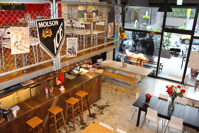 店內的空間挑高好高,店家隔出二樓的位置,並且有超大投影電視螢幕,用來看球賽超過癮!