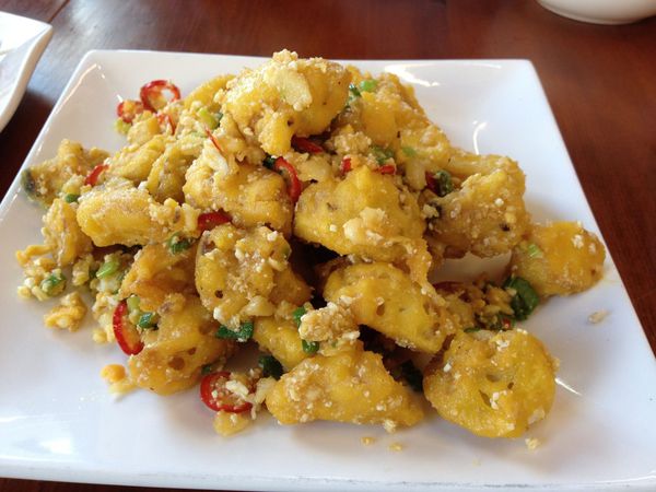 金沙杏鮑菇,以前還以為是一種菇類的名稱,後來才知是將鹹蛋黃與杏鮑菇炸至金黃色澤。