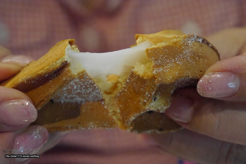 ↑一口咬下鬆餅,我發現裡面別有玄機!因為我咬到軟軟QQ的東西。