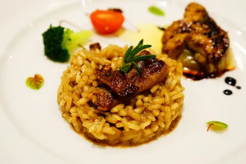 夏季新主菜~油封豬五花佐鳳梨小麥燉飯胡蘿蔔梨子泥,也是一道水果入菜的菜色