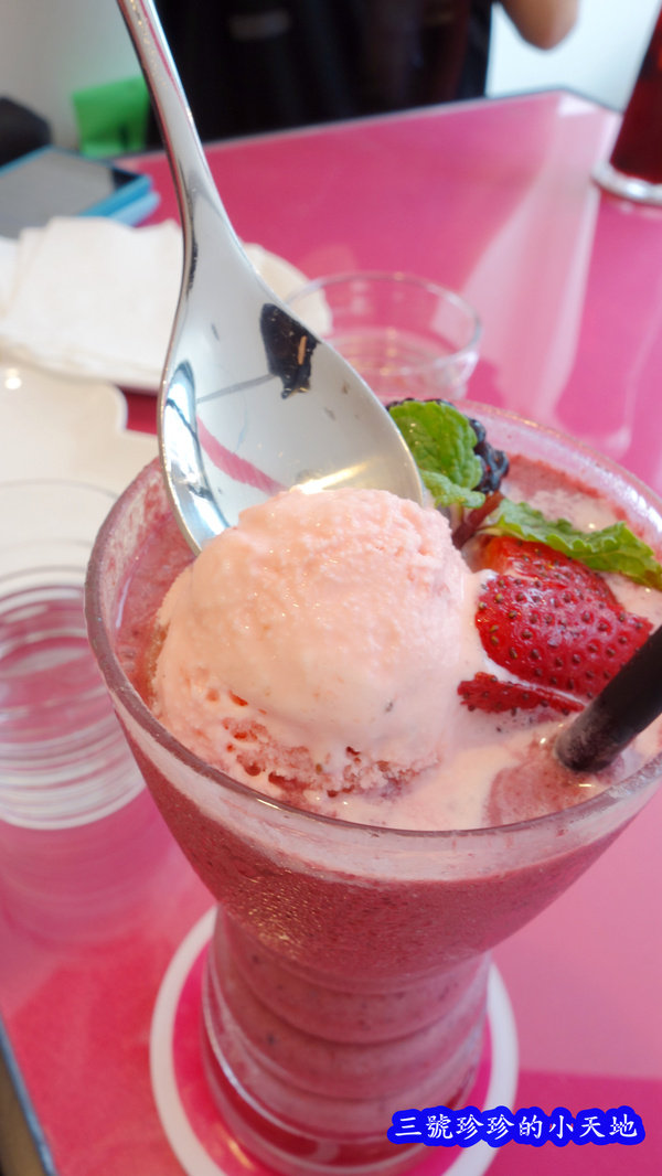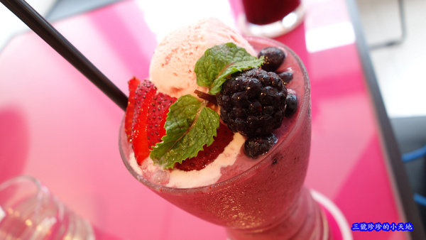 使用的是明治草莓口味的冰淇淋,混拌在莓果冰沙裡面一同飲用,冰沙細碎的口感,搭上綿潤的冰淇淋,酸酸甜甜超清涼,這道粉紅小姐真的很好喝耶!超級推薦~