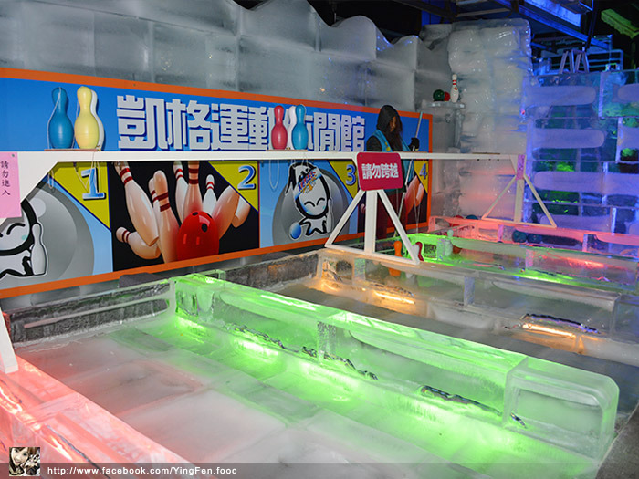 冰上運動場,冰磚球道的冰上保齡球,旁邊還有洗溝凹槽,弄得很真實,越走越冷我的手真的像冰棒一樣,還好這裡可以讓我動一動玩一玩。