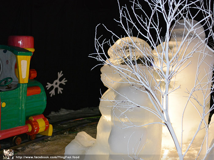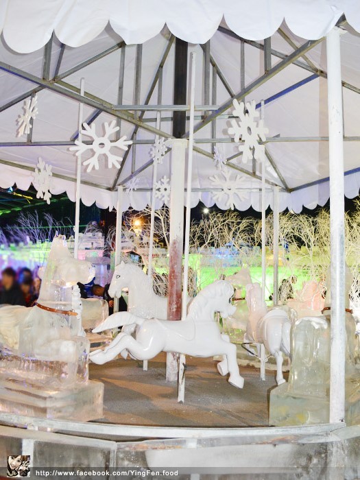 幾乎都是白色系列,有幾個冰雕木馬,上面吊著白色雪花,彷彿還到冬天的聖誕節一樣。