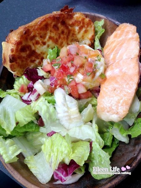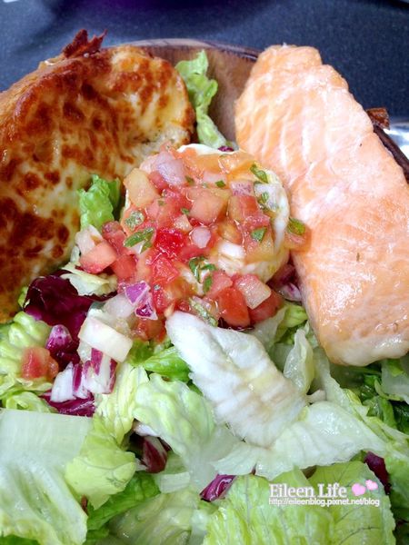 中間滿滿的蔬菜,搭配著份量剛好的鮭魚,再加上一片起司麵包(左上角)