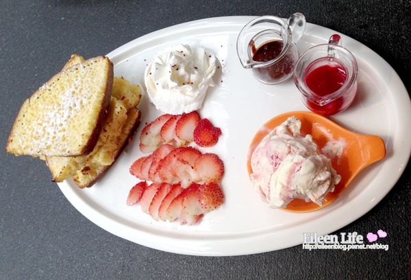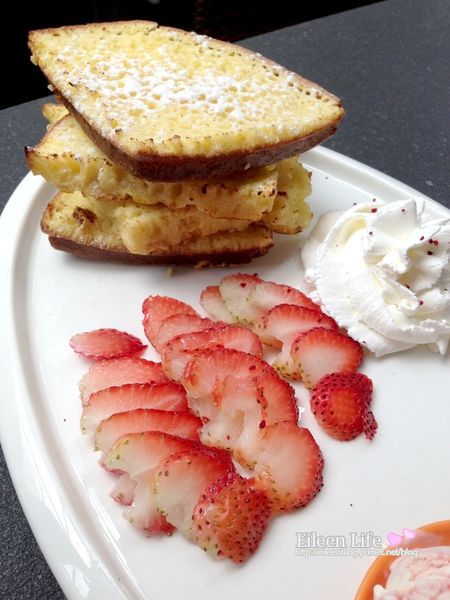 這天沒點飲料,只點了主餐及一份甜點,手工冰淇淋草苺鬆餅布丁,