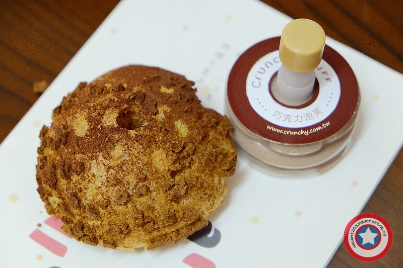 泡芙上頭灑上可可粉 內餡的巧克力如是常溫下吃會稍嫌甜膩