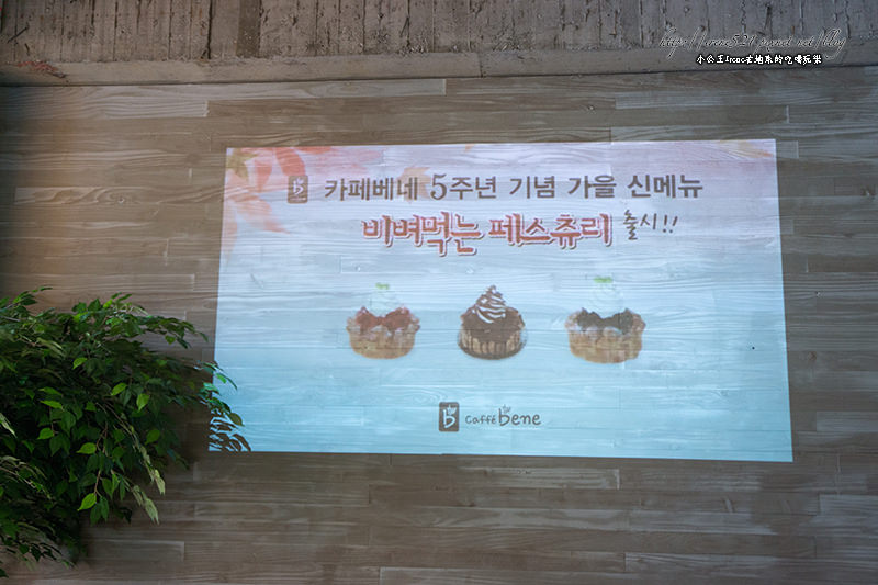 牆上的還投射著宣傳Caffe bene的影片,但是是韓文。