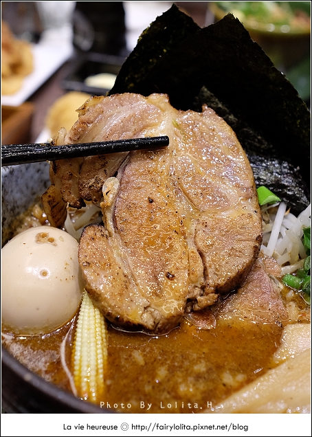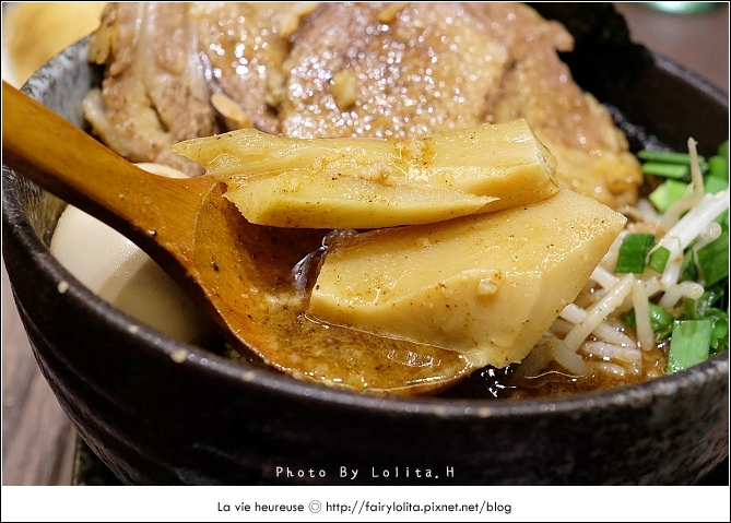 秉持著湯底是拉麵的靈魂,第一口我就先品嚐它的湯頭,完全傳承本店的濃郁及稠厚,差別在於添加的膠原蛋白較少,比較沒有唇間抿起來會有黏黏的感覺,湯裡加了肉末,咬到時還會在舌尖上綻放淡淡的香氣呦!