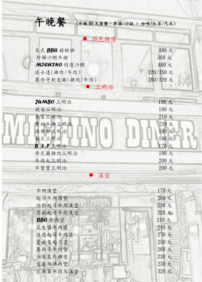 這張MENU漏拍了 摘自Michino官方Facebook(+80元可以升級套餐,有湯or沙拉 + 咖啡/紅茶/汽水)
