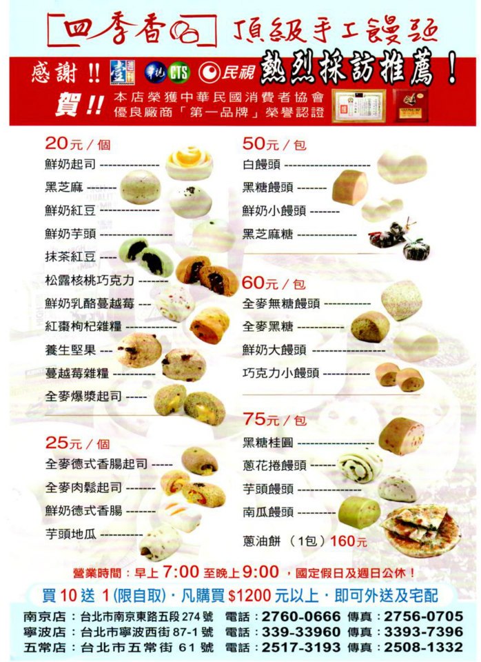四季香位於南京東路五段,由杜季香成立,饅頭價格都在20元上下,別與傳統的饅頭,如有松露巧克力跟抹茶口味,都讓人食指大動 四季香饅頭的製作方法非常嚴苛及要求,全身赤裸的饅頭,蒸時要墊一張烘焙紙或是用盤子裝盛著,否則饅頭直接接觸到水蒸氣,會變的溼溼軟軟。