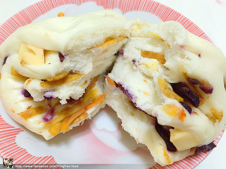 把饅頭打開展示開來,清楚看到有包好多料,可以吃到黃色和紫色地瓜絲,口感很像在吃地瓜一樣自然原味,還有我最愛的乳酪塊,味道很香濃可口入口即化,饅頭有彈性口感,整個吃起來地瓜帶有乳酪香味,甜甜鹹鹹的味道,很好吃我蠻喜歡的。