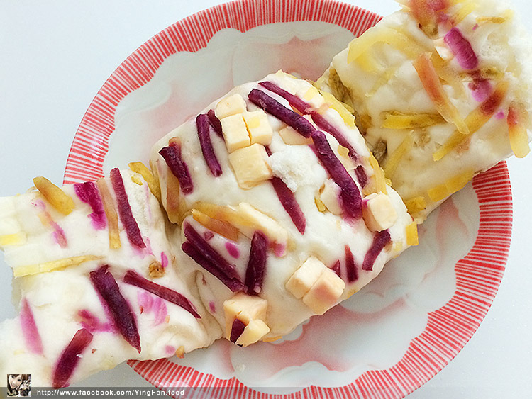 裡面有包乳酪塊和芋頭絲,看起來好豐富,一打開裡面好多層次,吃起來乳酪好濃郁。