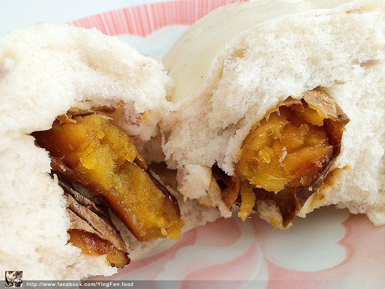 外層是芋頭饅頭,可以吃到芋頭一粒粒的口感,內餡是一整條的黃色地瓜,地瓜有水份,不會有感覺到乾乾的,而且地瓜很香甜好好吃,另外地瓜有皮,我很少看見地瓜饅頭包有皮的地瓜,聽說地瓜可以連同皮一起吃,皮的營養價值很高,不過我們在外面吃烤地瓜,幾乎都不吃皮,包在饅頭的地瓜我可以安心吃,店家有處理過很安心吃地瓜。