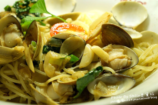 配料有:白酒、蛤蠣、洋蔥、大蒜、番茄、羅勒