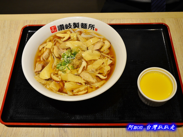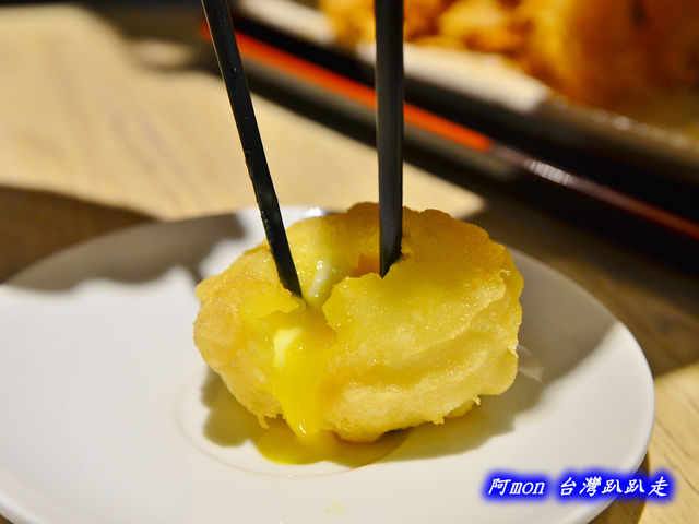 印象中的溫泉蛋都是沒有外面這層金黃色麵衣的,但讚岐製麵所有將它下鍋油炸,用筷子去切蛋的時候,觸感還是很軟的,輕輕一切,就有金黃色的蛋液滾滾流出,看起來就好美味,也不要浪費了這些蛋黃,拿來沾烏龍麵吃超棒的。