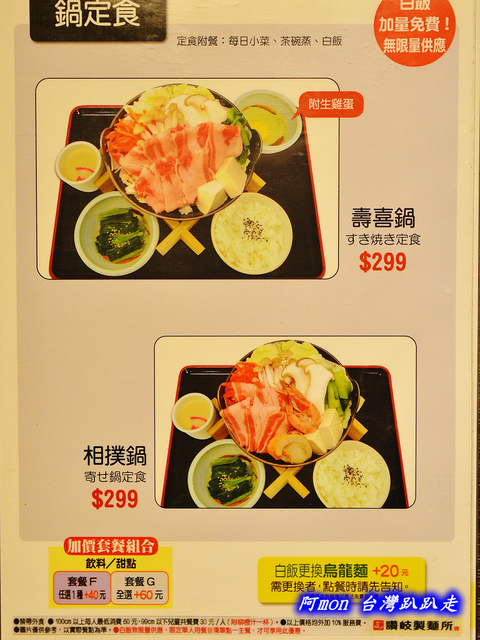 如果怕吃麵吃不飽的話,另外有套餐可選,分成ABC三種,所包含的附餐數量也不同,沙拉、茶碗蒸、每日小菜是固定的,而飲料和甜點則有多款可以作選擇。
