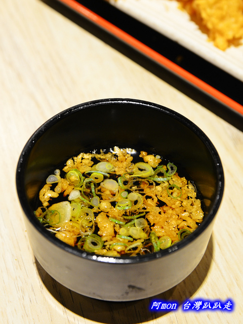 跟平常吃的天婦羅醬汁也不一樣,平常的會有加入蘿蔔泥,但這邊是用蔥花、炸麵衣、芥末加入醬油中調製,所以吃起來會有點芥末的辛香,很特別的一款沾醬,讓我還蠻愛的。