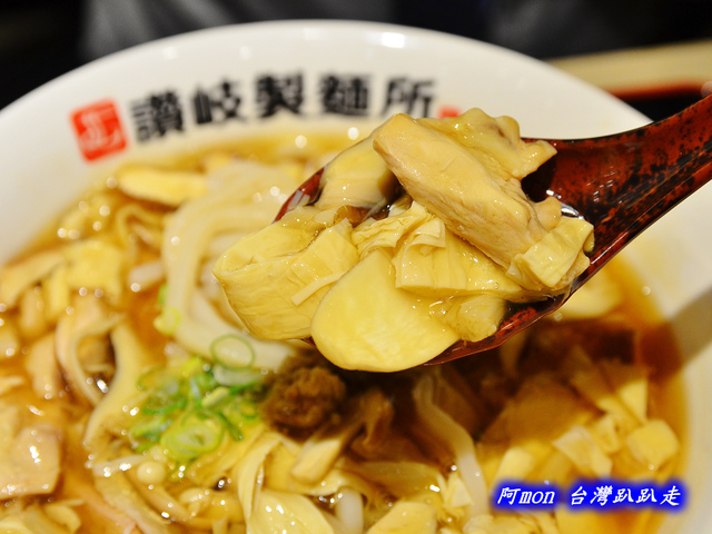 湯 頭部分喝起來挺濃郁的,另外因為有加入薑末的關係,所以帶點些許的薑辛味,讓湯的味道更好喝,冬天吃這個應該更讚。吃的時候要先攪拌一下讓薑能跟湯汁混 合。也因為湯汁較濃稠的,所以吃起來有點像在吃羹麵,還蠻特別的。烏龍麵很Q彈滑溜,配上嫩口的雞肉,吸飽湯汁的豆皮、香菇,口感多層次又好吃。