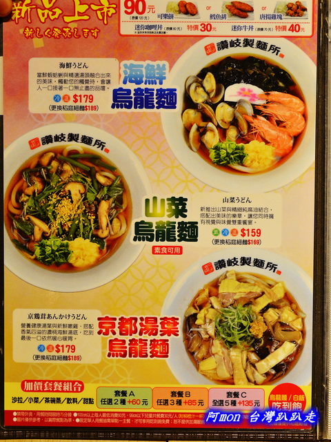 讚 岐製麵所的烏龍麵口味選擇超級多,主菜的選擇野很多樣化,肉、海鮮、蔬菜都有,然後還可以升級成套餐喔。烏龍麵部分則可以選擇冷的或溫的,夏天的話吃冷麵 也還蠻不錯的。另外就是從6月起,讚岐烏龍麵可以免費加麵吃到飽,不過提供的加麵服務是使用稻庭細麵,而不是一般的烏龍麵喔。