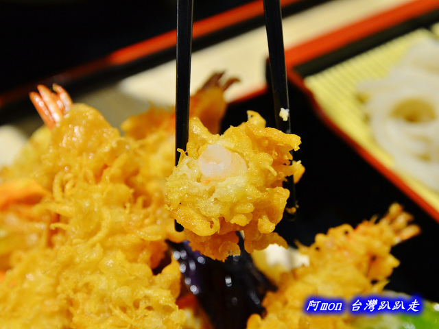除了原本就有的炸蝦外,還有一顆溫泉蛋、茄子、青椒、炸野菜等,將整盤塞滿滿的,炸野菜是用紅蘿蔔絲、洋蔥絲下去一起油炸,吃起有蔬菜的甜味,這份吃完後讓我印象最深刻的是炸蝦和炸溫泉蛋。