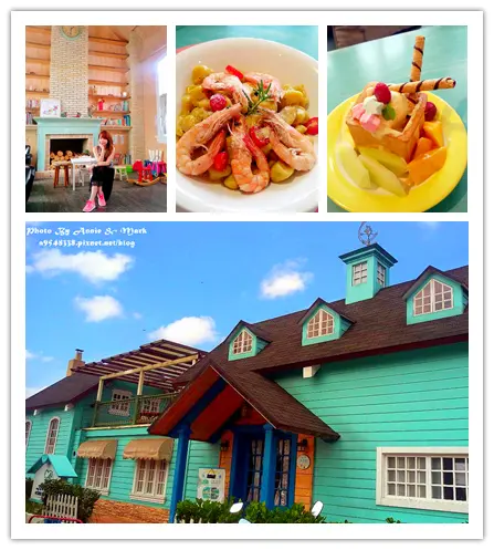 建築整棟以粉藍色為主要基調、黑色斜屋頂、白色格木窗,還有小煙囪....