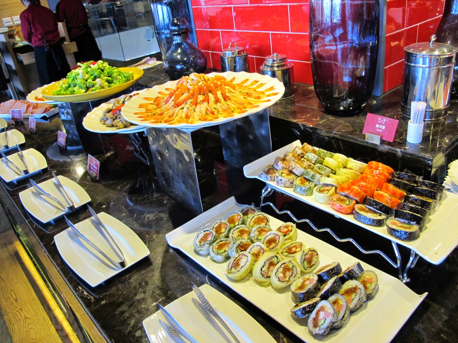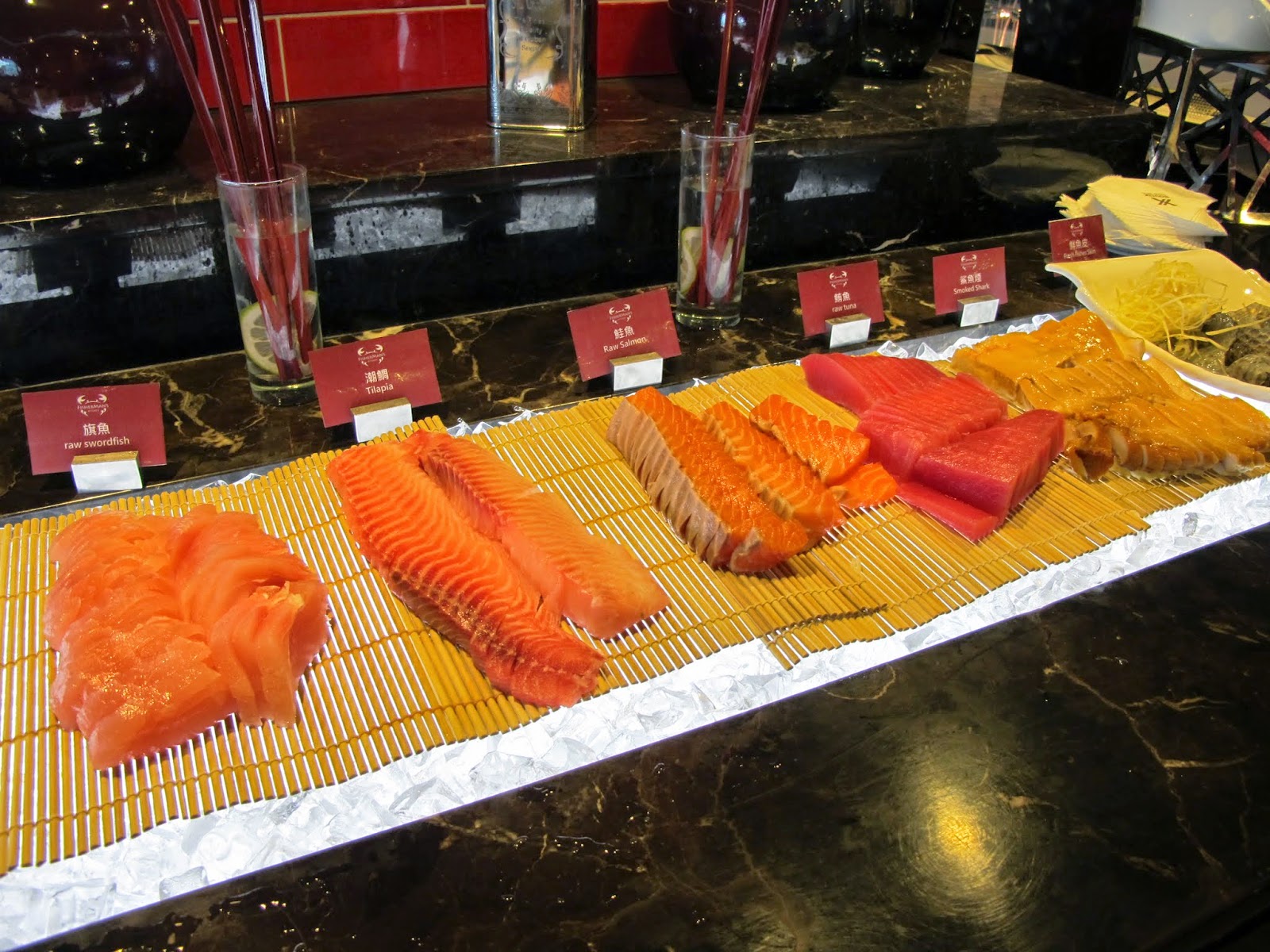 餐廳名為漁夫餐廳,可想見菜單以海鮮料理為主,雖然自助餐檯有很多琳瑯滿目的料理,但我為了保留我的胃給龍蝦帝王蟹和肋眼牛排,因此只淺嚐了幾樣海鮮現做料理、生魚片及蔬菜,就等著我的龍蝦上桌囉!