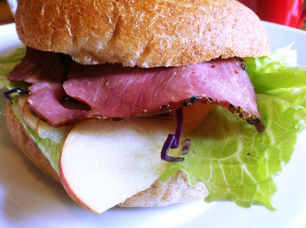 裡頭有新鮮生菜、切片蘋果、燻牛肉、一些優格沙拉醬