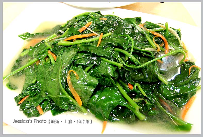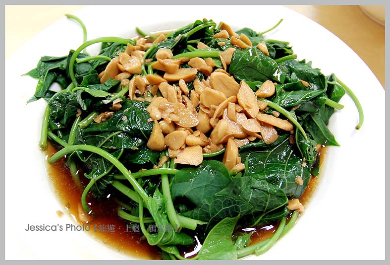 下圖,地瓜葉非常嫩,上面是醃過的蒜頭。我平時不吃地瓜葉,因為常吃到粗的,但這真是嫩到非常好吃。