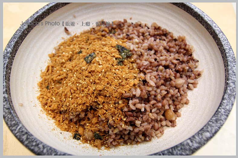 下圖,什錦雜糧。紫米、鷹嘴豆?上方是素鬆,口味很清淡,這道普普。吃不夠,可續!