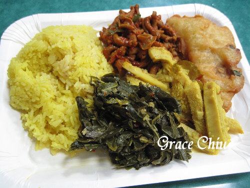 後記:今天再跑去吃自助餐,本來想吃薑黃飯但還沒煮好所以後添了白飯,舀了四樣菜跟一尾小卷,店員計價收100元,小卷旁有點褐色的東西我原以為是筍絲類,但吃下去有一層層中間又有心又覺得像是洋蔥,滷的很柔軟(後詢問外籍勞工朋友說這是菠蘿蜜),右上的青菜炒了咖哩味醬汁,右下角是雞肝.