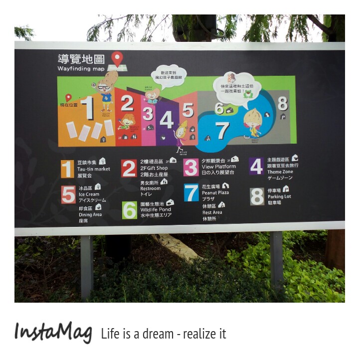 桃園大溪龍情魔幻豆子主題館,是2014年5月24日新開幕的,透過導覽地圖,可以看見主要的分布區域分別是:1.豆鎮市集2.禮品區3.夕照觀景台4.主題遊戲區5.冰品區6.園藝生態池7.花生廣場8.停車場