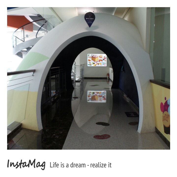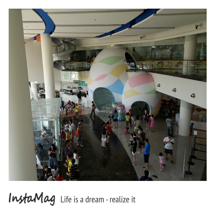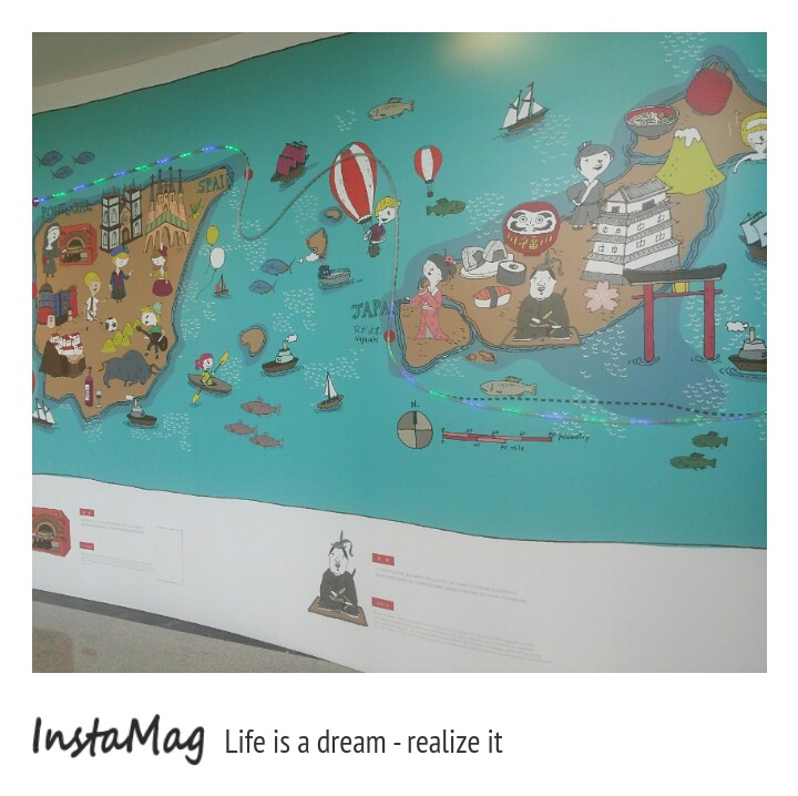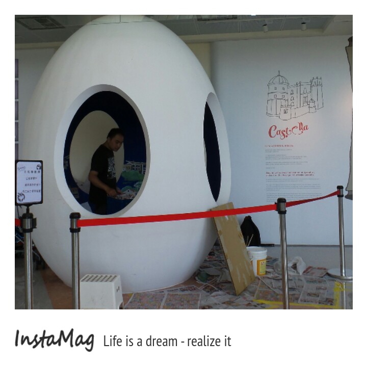 金格食品建築為一棟綠能建築喔,採用最新的太陽能發電系統,廢熱和雨水回收系統,小巨蛋的大橢圓形彩色蛋殼是這裡標記,每一顆蛋都有不同的功能,最左邊撥放著環繞式投影,介紹觀光工廠的心路歷程,中間的裝置藝術有座椅,周圍佈置的優雅別緻,像個小小的休息室,櫃檯前的這顆蛋畫家還在建置內景,裡面有小小的房子及小船,說明,著大約在5百年前,西班牙人為打開與日本的貿易,把長崎蛋糕作為貢品傳入日本,因其香氣和細膩的口感在日本成為極品的糕點後,廣為流傳