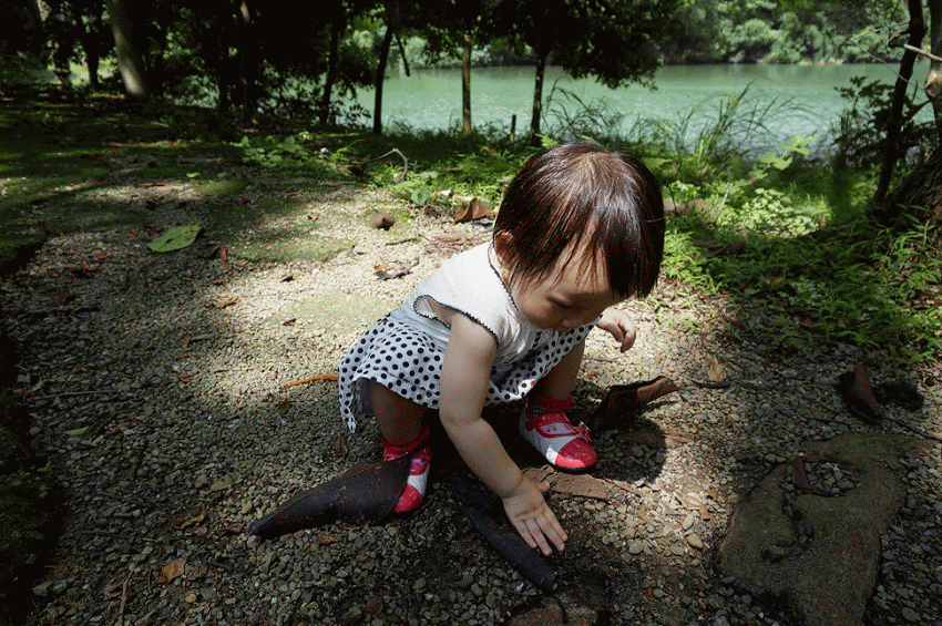只要有小孩在的地方,俯拾即是對他們而言都是好玩的、新奇的。讓Q比盡情玩了幾分鐘後,幫她拍拍手上