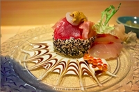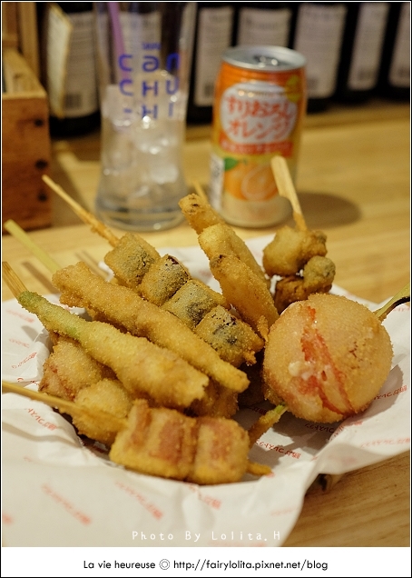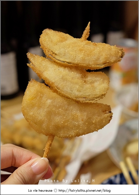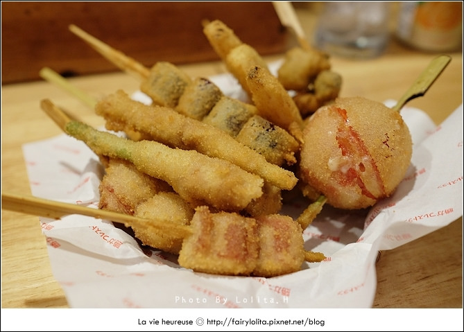 炸物有培根起士卷、蕃茄拿坡里、干貝培根捲、蕃茄牛肉卷、培根蘆筍、洋蔥、茄子及香菇,麵衣酥脆又薄透,吃起來一點也不油膩,外皮先沾麵糊、再裏上一層饅頭磨碎的麵包粉,不僅口感不同於一般炸物,而且火候的拿捏功夫也不錯,不管是咬到的是肉塊、海鮮亦或蔬菜,都能感受食材蘊含的湯汁呦!