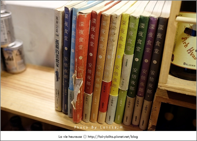 檯子上放有在日本非常火紅的深夜食堂,是說看到這一排書就讓我想到電視版的日劇,溫暖劇情,十足擁有療癒的效果。