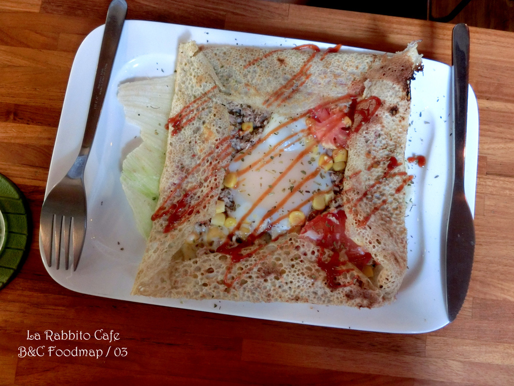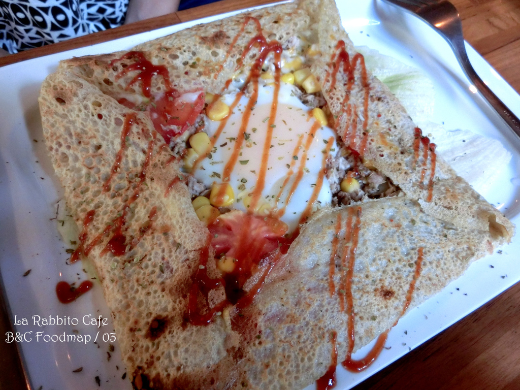 黃金番茄鮪魚法式可麗餅NT 150/ 除了甜味可麗餅外這邊也有鹹味可麗餅可以選擇,鹹味可麗餅還有附半熟蛋一顆,以可麗餅作為基底,上面在鋪滿鮪魚、玉米、番茄,最後再打上一顆半熟蛋,以番茄醬及日式香鬆作為調味,可麗餅皮偏軟但有濃濃的蛋香與鮪魚一起入口,再加上半熟蛋,口感不會太乾,也是一款很清爽的餐點,份量蠻適合女生吃的但如果是男生或當天想吃很飽的話可能會不夠噢。